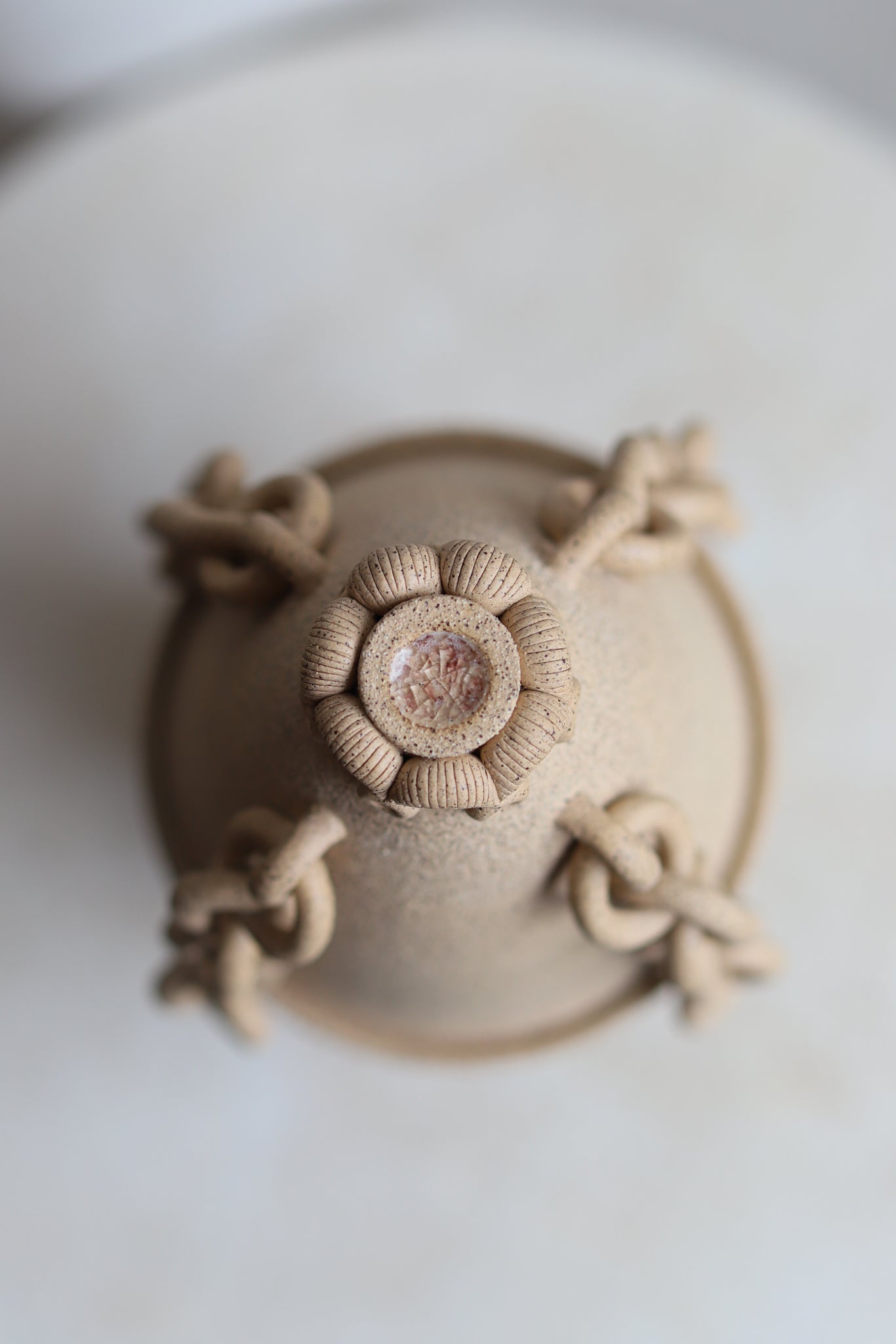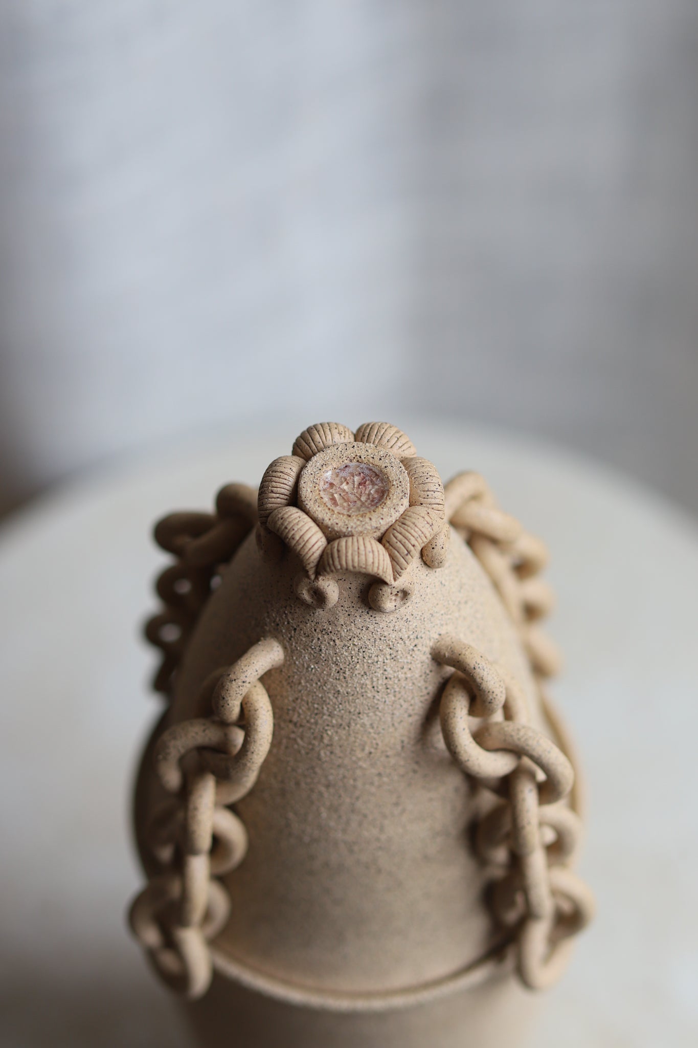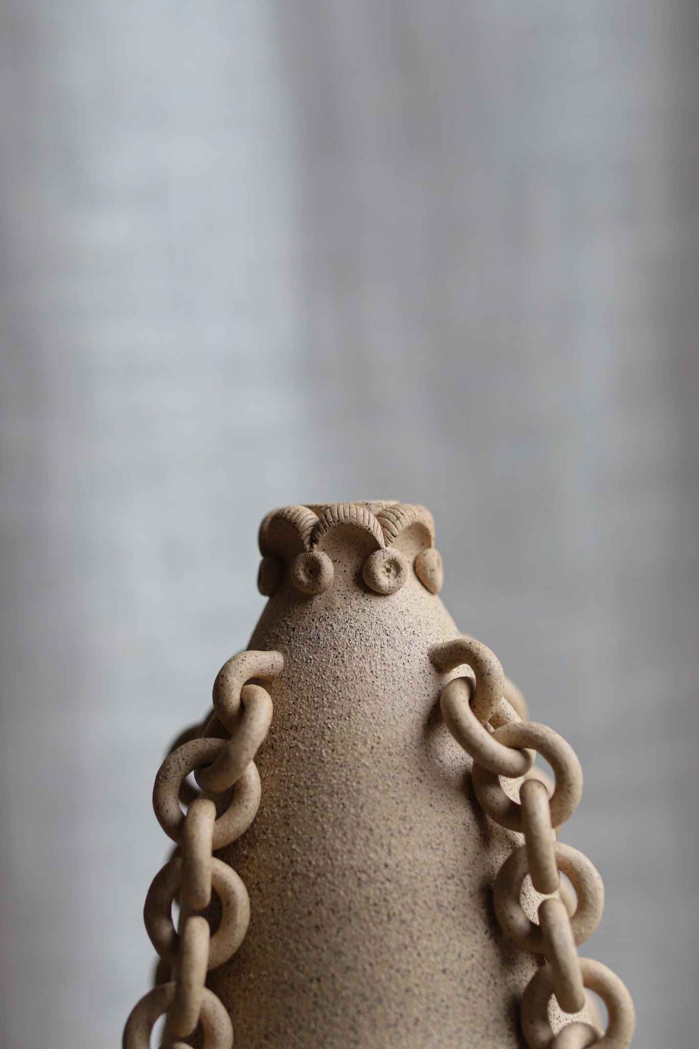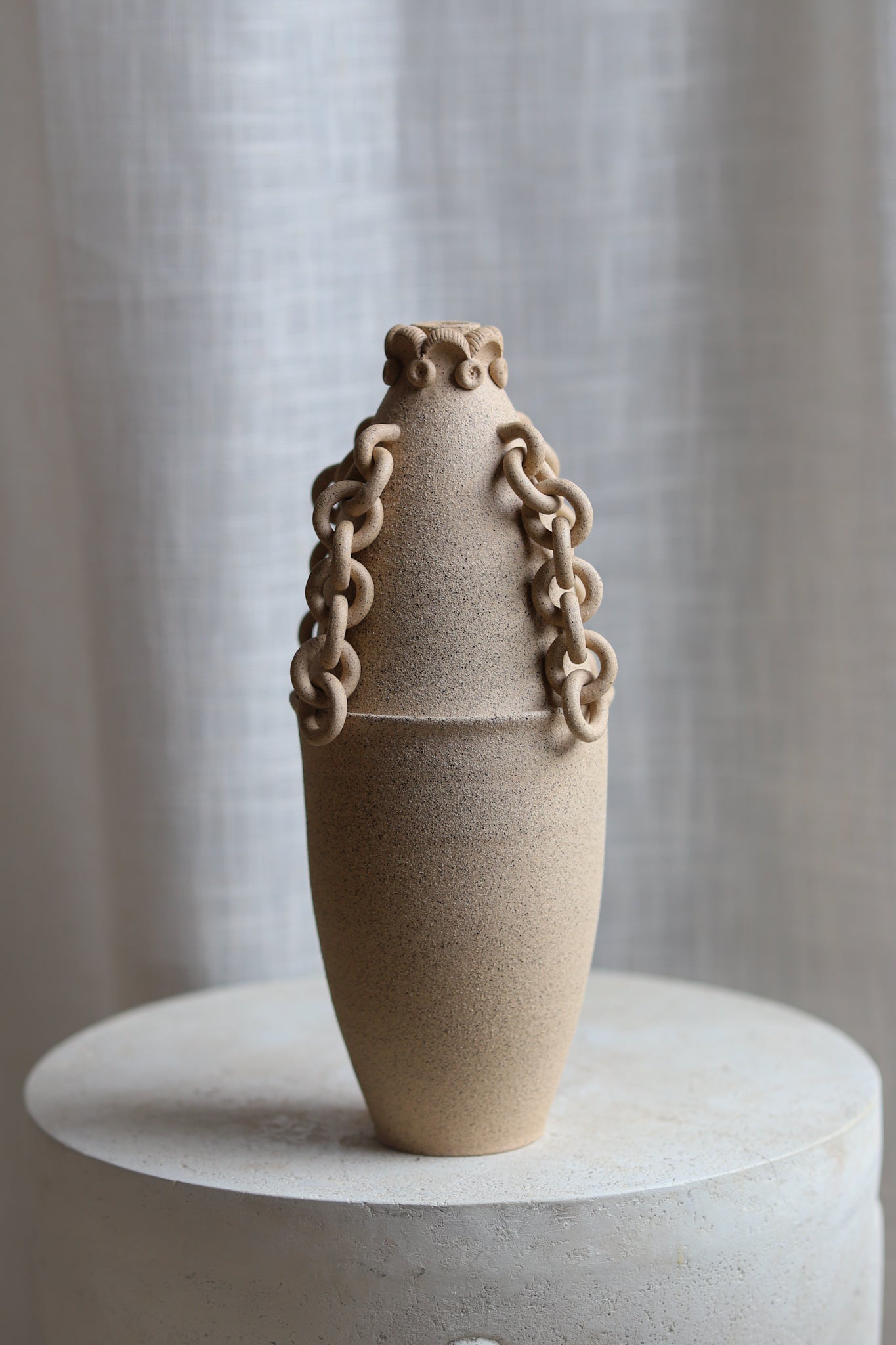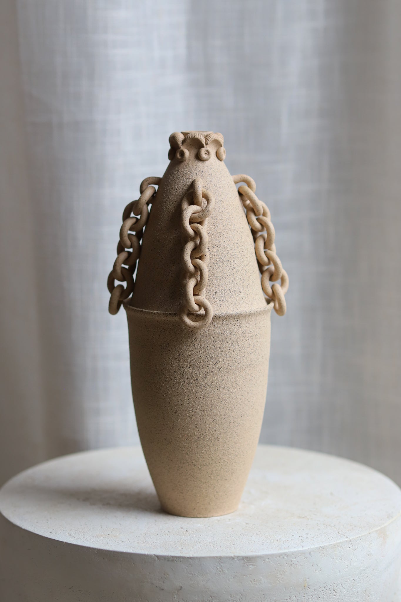 Hand-thrown decorative jar with a black-speckled sandy finish. This piece has gone through the creative process of being hand-thrown, hand-sculpted, trimmed, fired in a kiln, glazed, and fired in a kiln once more. The chains and sculptoral elements are crafted by hand and sealed for added protection. Due to the nature of handmade ceramics, each piece is unique and there may be small imperfections.