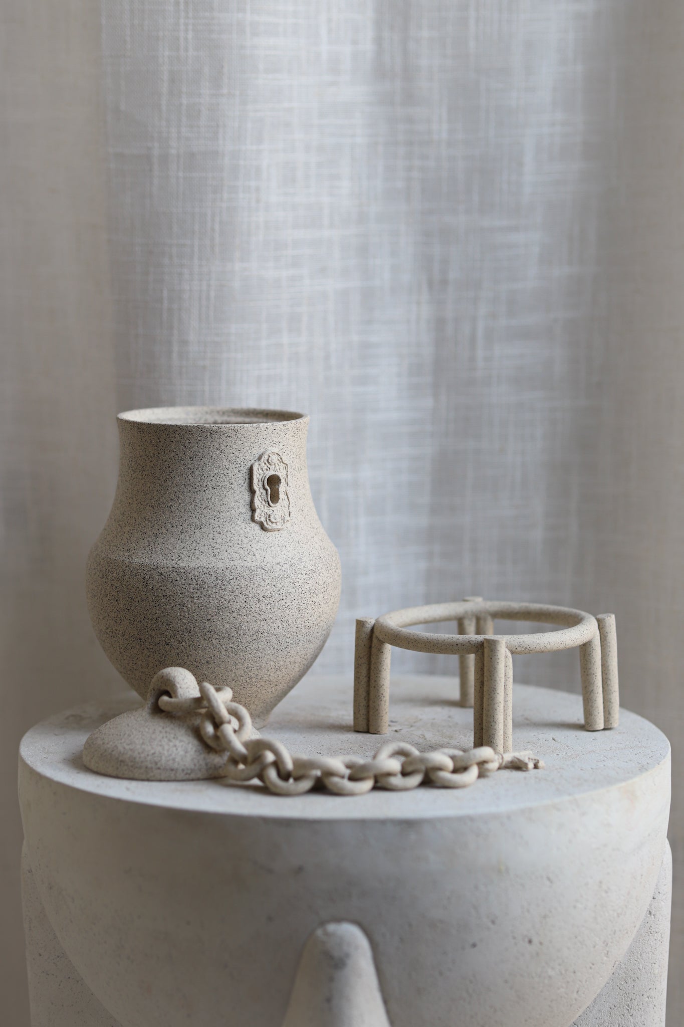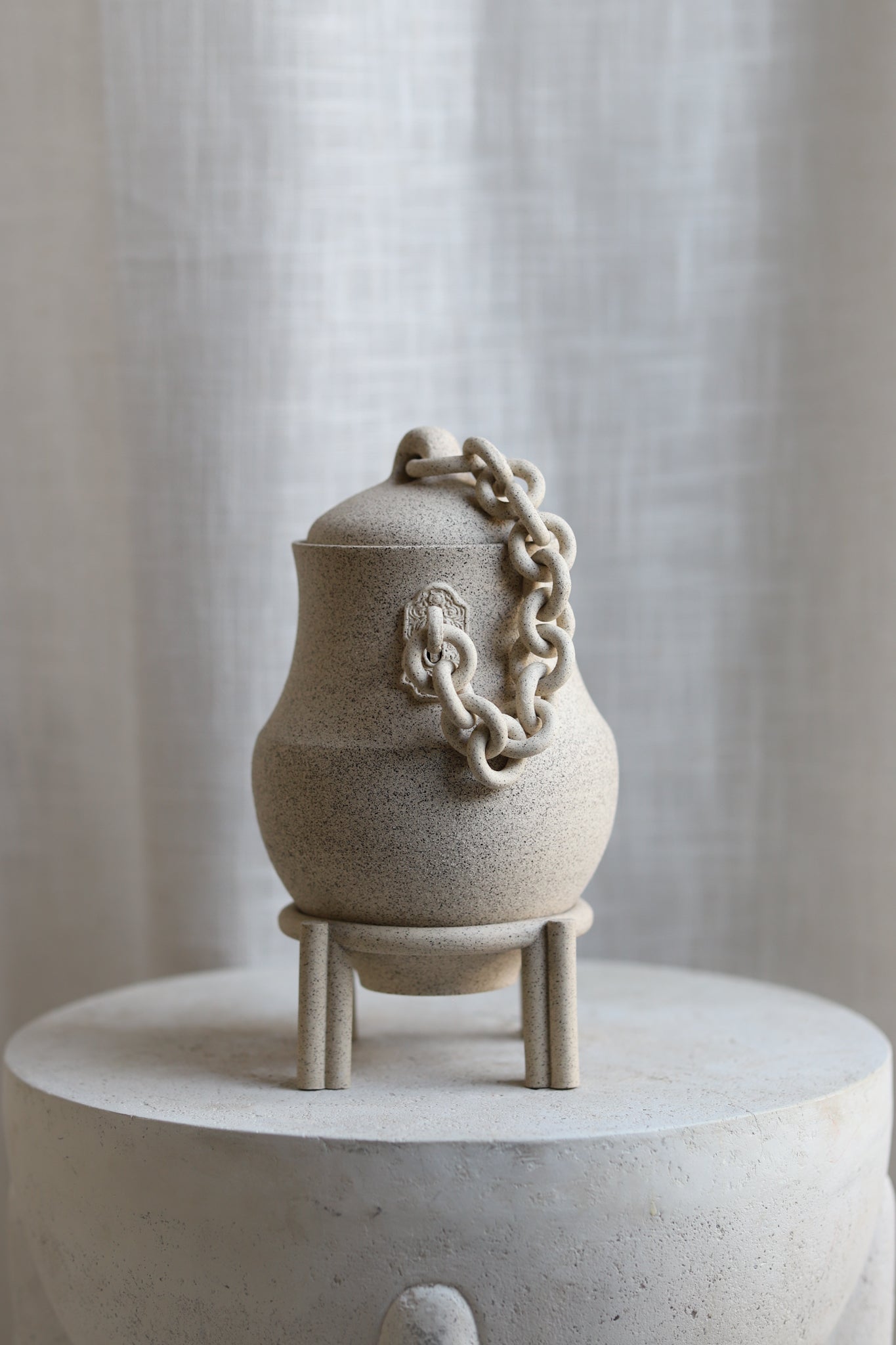 Hand-thrown jar with a speckled-stone finish. This piece has gone through the creative process of being hand-thrown, hand-sculpted, trimmed, fired in a kiln, glazed, and fired in a kiln once more. The chains, stand and sculptoral elements are crafted by hand and sealed for added protection. Due to the nature of handmade ceramics, each piece is unique and there may be small imperfections.