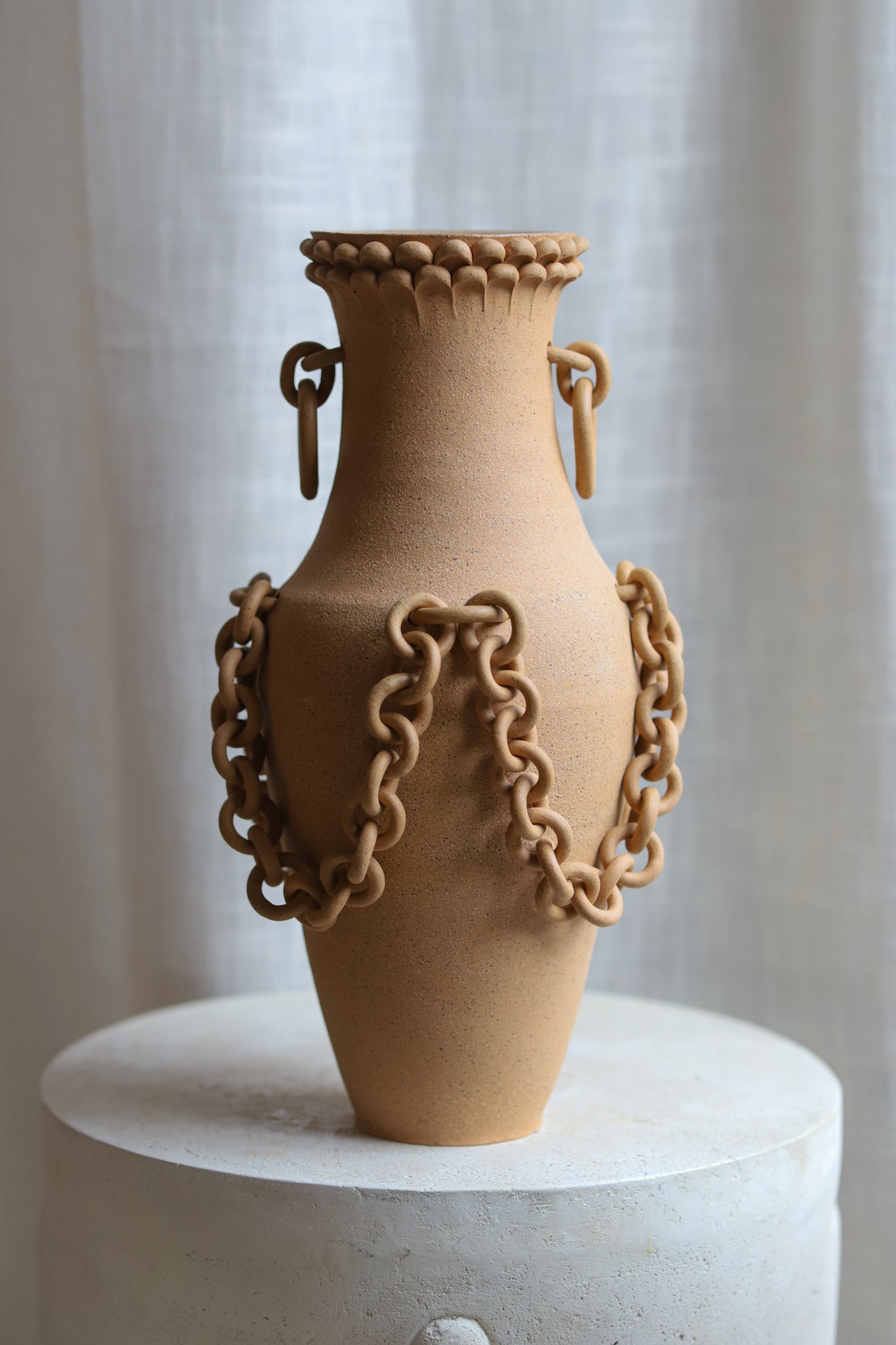 Hand-thrown decorative vase with a black-speckled buff finish. This piece has gone through the creative process of being hand-thrown, hand-sculpted, trimmed, fired in a kiln, glazed, and fired in a kiln once more. The chains and sculptoral elements are crafted by hand and sealed for added protection. Due to the nature of handmade ceramics, each piece is unique and there may be small imperfections.